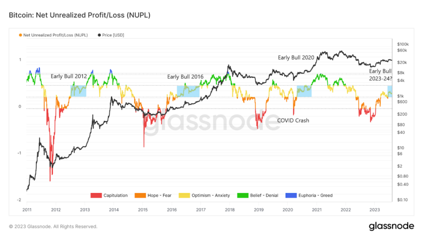 Теперь можно попытаться переложить полученные результаты на текущую рыночную ситуацию. Мы предполагаем, что накопление биткоина на раннем бычьем рынке началось в середине июня 2023 года. Тогда индикатор NUPL отскочил от оранжевой области надежд и вошел в желтую область оптимизма.