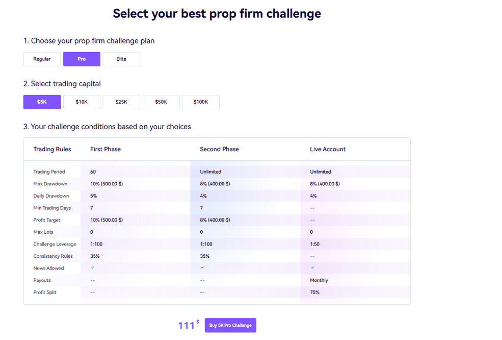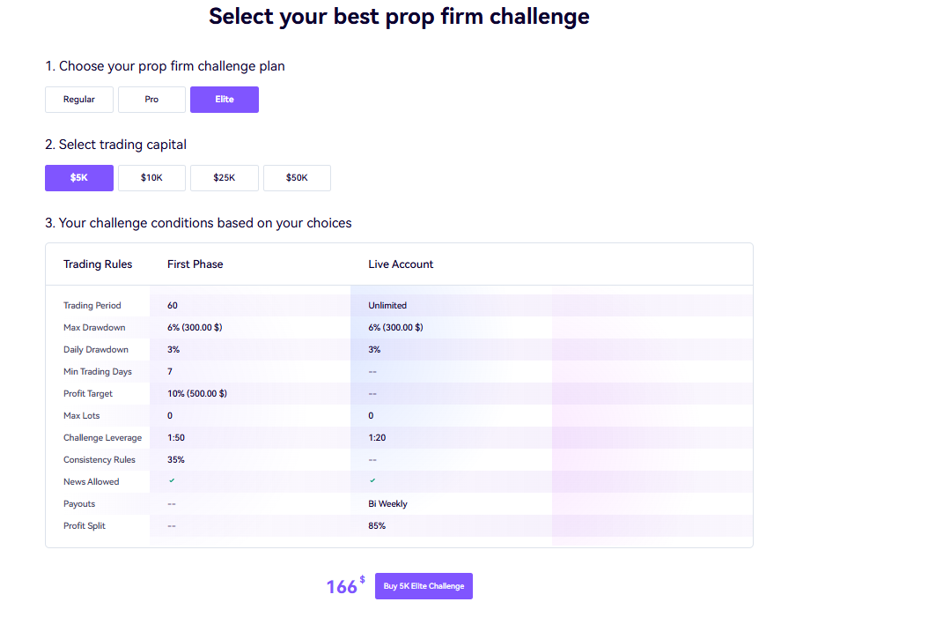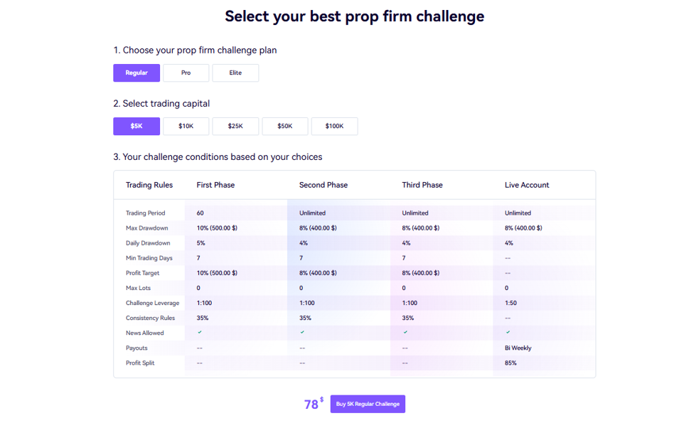 Perfect for newcomers entering prop trading for the first time. Simple rules, realistic profit targets, and controlled risk make this plan a confident starting point.
