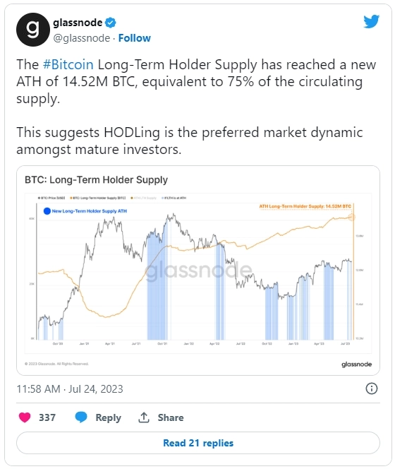 Что произошло? Количество биткоинов на счетах долгосрочных держателей 24 июля достигло 14,52 млн монет, что стало новым историческим максимумом (ATH). Согласно данным аналитиков платформы Glassnode, показатель эквивалентен 75% от общего циркулирующего предложения актива.