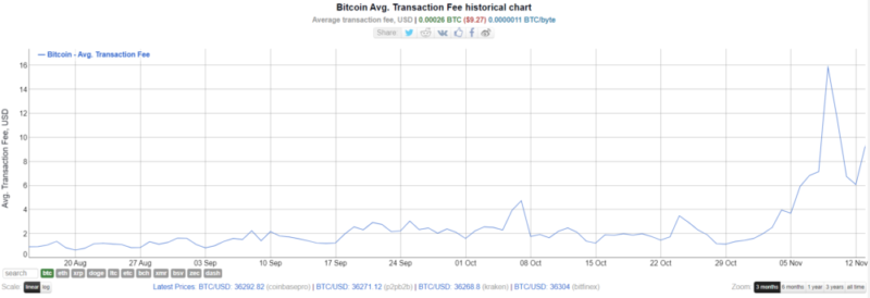 Цена транзакций в сети Биткоин возросли с 1,6 доллара до 9 долларов на данный момент. Об этом указывает сервис BitInfoCharts. Пик роста комиссий был зафиксирован 9 ноября. Тогда цена составила 15 долларов. Это самый высокий показатель с мая текущего года.