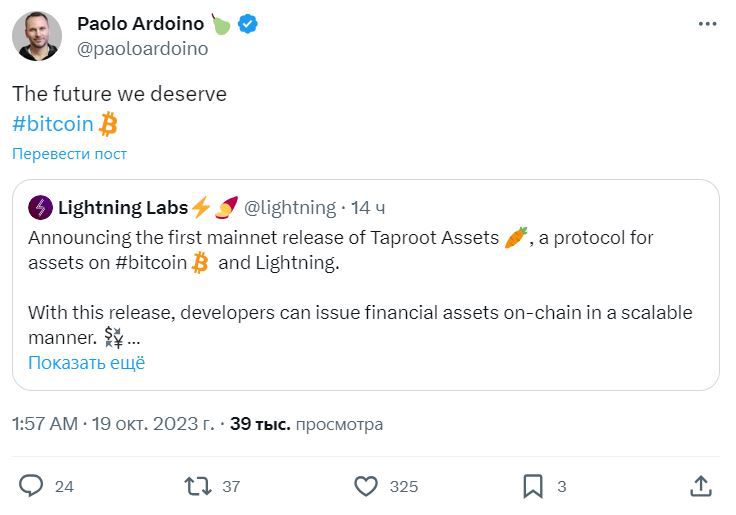 Одним из первых новость о запуске Taproot Assets прокомментировал генеральный директор Tether — компании, которая занимается выпуском стейблкоина USDT. По словам Паоло Ардоино, инструмент позволит создать «будущее, которое мы заслужили». При этом он не ответил на вопросы подписчиков о том, стоит ли ждать Tether на биткоине.