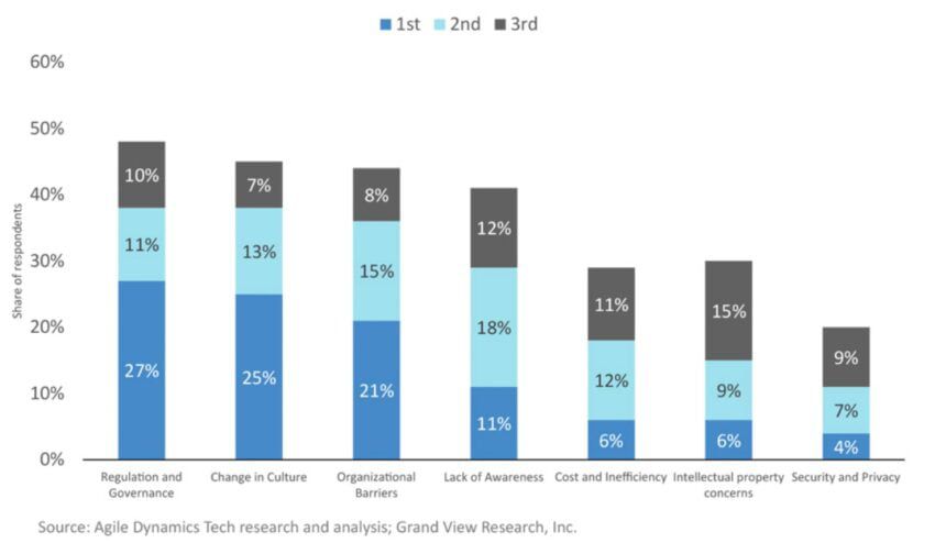 Большинство респондентов назвали главной проблемой регулирование. Пока технология по-прежнему находится на этапе разработки, что пугает регуляторов во всем мире.