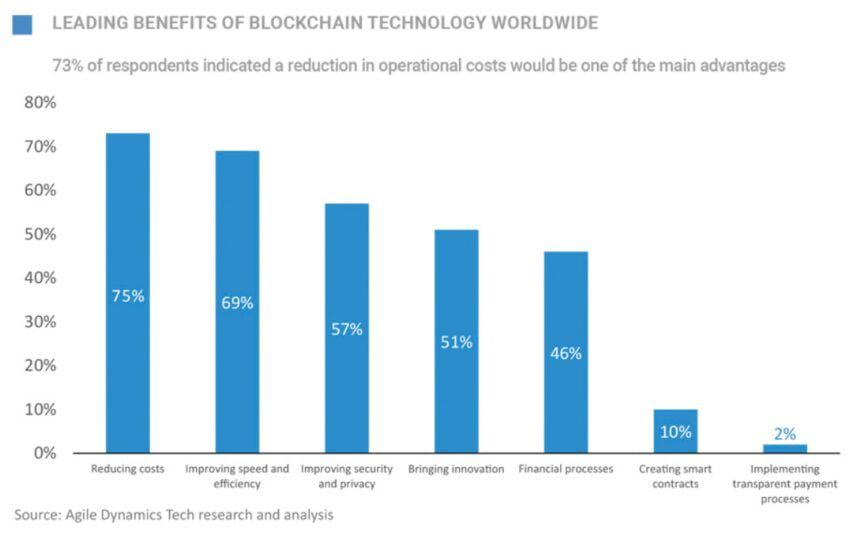 В отчете специалисты привели результаты опроса по поводу плюсов блокчейна. 73% руководителей различных компаний считают, что технология также способна сократить и операционные расходы. 67% респондентов высказались за скорость и эффективность работы, а 55% отметили повышение уровня конфиденциальности.