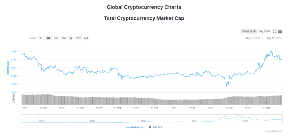 Согласно данным CoinMarketCap, общая капитализация рынка криптовалют за последние 24 часа выросла на 0,66% до 1,18 трлн долларов США, а объем рынка увеличился на 42,48% до 32,32 млрд долларов.