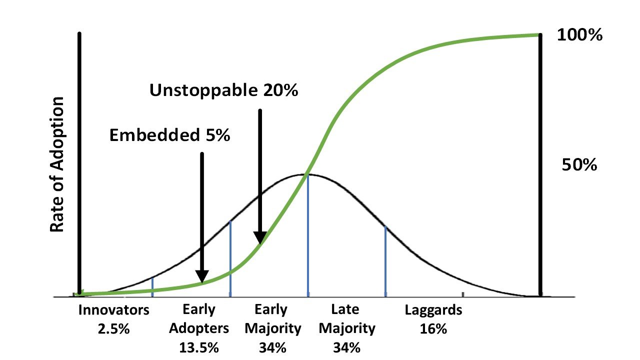 S-образные кривые используются для визуализации траектории чего-либо, в данном случае для принятия технологии. Обычно процесс начинается медленно, затем быстро ускоряется и, наконец, достигает равновесия.
