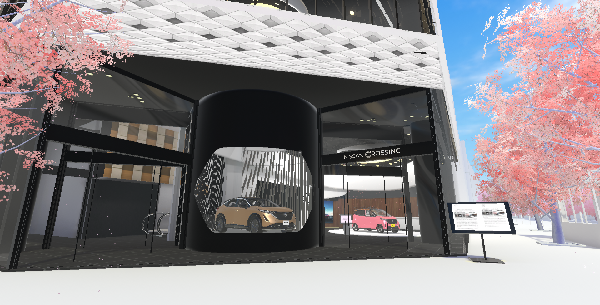 В 2022 году компания Nissan создала свой интерактивный мир на платформе VRChat. На локации Nissan Crossing пользователи могут посетить дилерский центр, в котором представлена презентация автомобилей. Внутри здания стоят фотореалистичные модели Nissan Sakura и Nissan Ariya. Локацию создали специально для презентации выхода продукта на японский рынок.