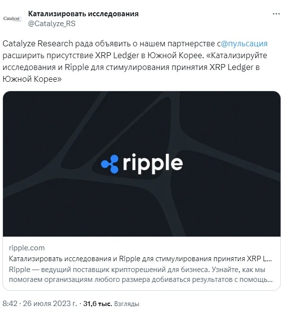 Catalyze Research, консалтинговая компания, специализирующаяся на решениях Web3 и блокчейне, объявила о сотрудничестве с Ripple. Это партнерство направлено на укрепление присутствия XRP Ledger (XRPL) на динамично развивающемся южнокорейском рынке.